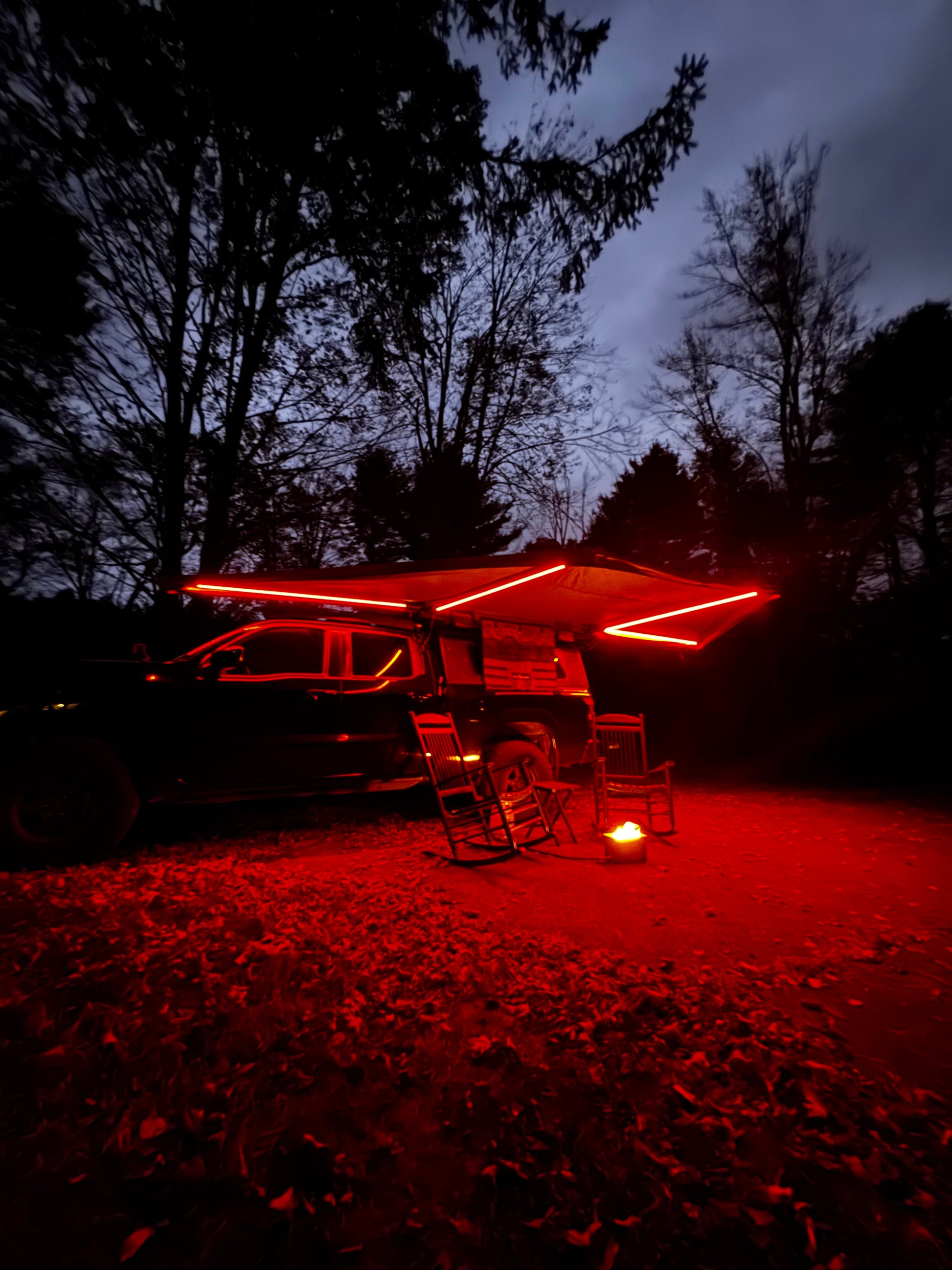 Integrated LED light bars in the four main awning arms (White/Red, dimmable, USB powered, IP67 waterproof)